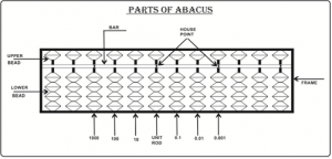 An abacus tool Soroban (from Unit’s place, which is the Unit Rod) represents the place value of digits in ascending order that is from right to left as 1, 10, 100, 1000 etc. The rows from left to right denote decimal numbers. Using a simple wooden tool, we can do calculations of numbers even at billions place value. It consists of 13 0r 17 rods and each rod has 5 beads. The beam of a tool separates the upper and lower part of the tool. The lower beads are called earth beads whereas beads in the upper part are called the heavenly beads.