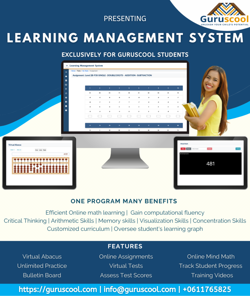 Learning from home has led everyone to a common goal shaping our children’s future and keeping them engaged. Every parent must support learning by being involved in the learning process. Our new LMS platform makes it a breeze. Let’s learn more about the same.The LMS allows students to access training material, complete assignments, tests, exams, and access various tools to do the practice. It is a platform where students and parents can get updated with curriculum, assignments, assessments, student performance, fee payment, and other support material. In addition, using this platform helps to bridge the communication gap between parents and teachers. The LMS allows teachers to keep records of every student and also helps to deliver personalized learning programs.The LMS makes use of the latest technologies and provides tools to keep learners engaged. Using LMS offers flexibility to learn at your own pace. The use of modern abacus math learning tools improves students’ ability to understand and makes learning fun. It gives location and time independence, and so the process of learning never stops. LMS’s open learning platform creates a private learning space by using practice worksheets and engaging content. LMS has features that facilitate and make collaboration easy between teachers, parents, and students. The portal also provides a complete operations management system for the enterprise and will help Guruscool offer an enhanced level of service to the students, teachers, and parents.